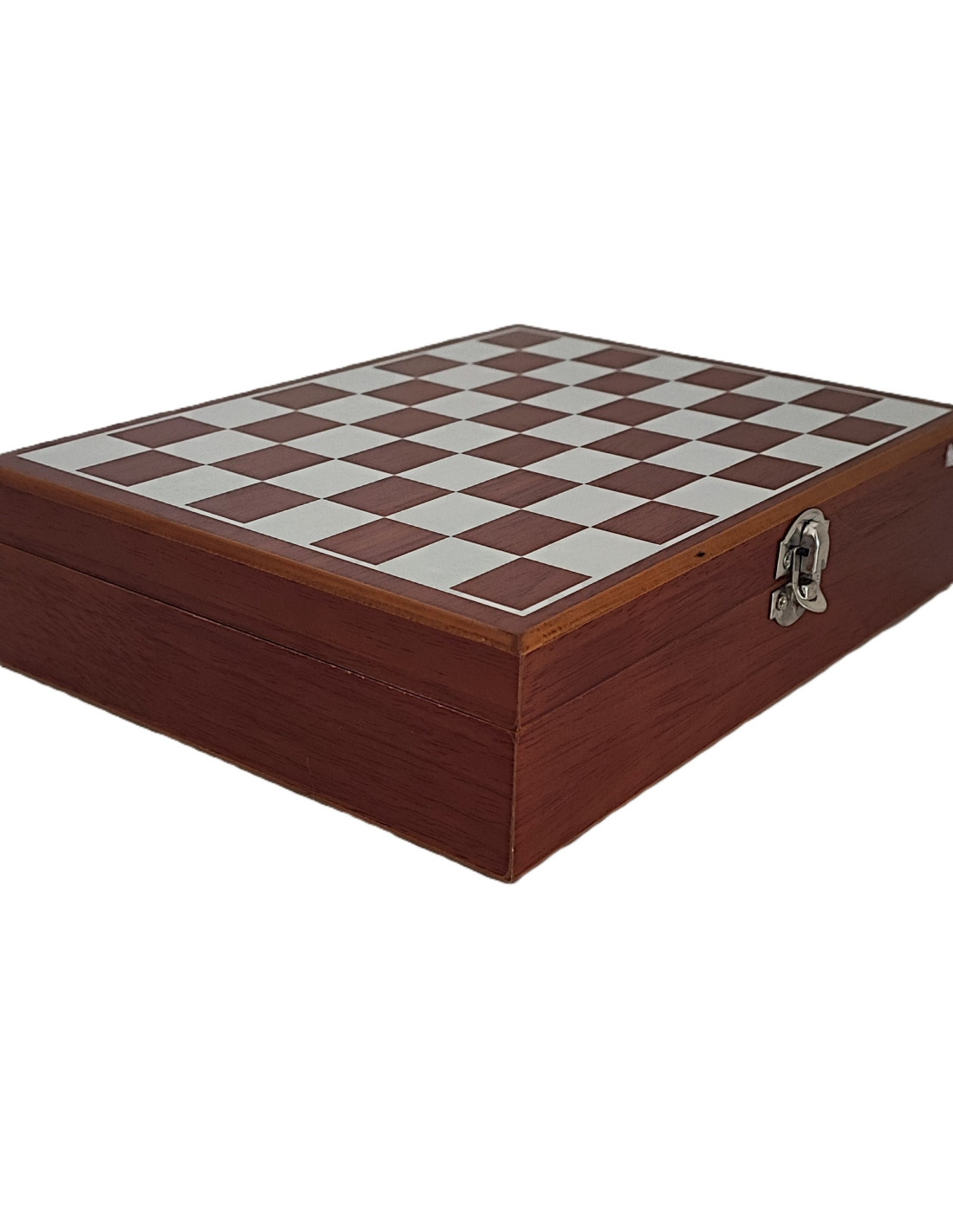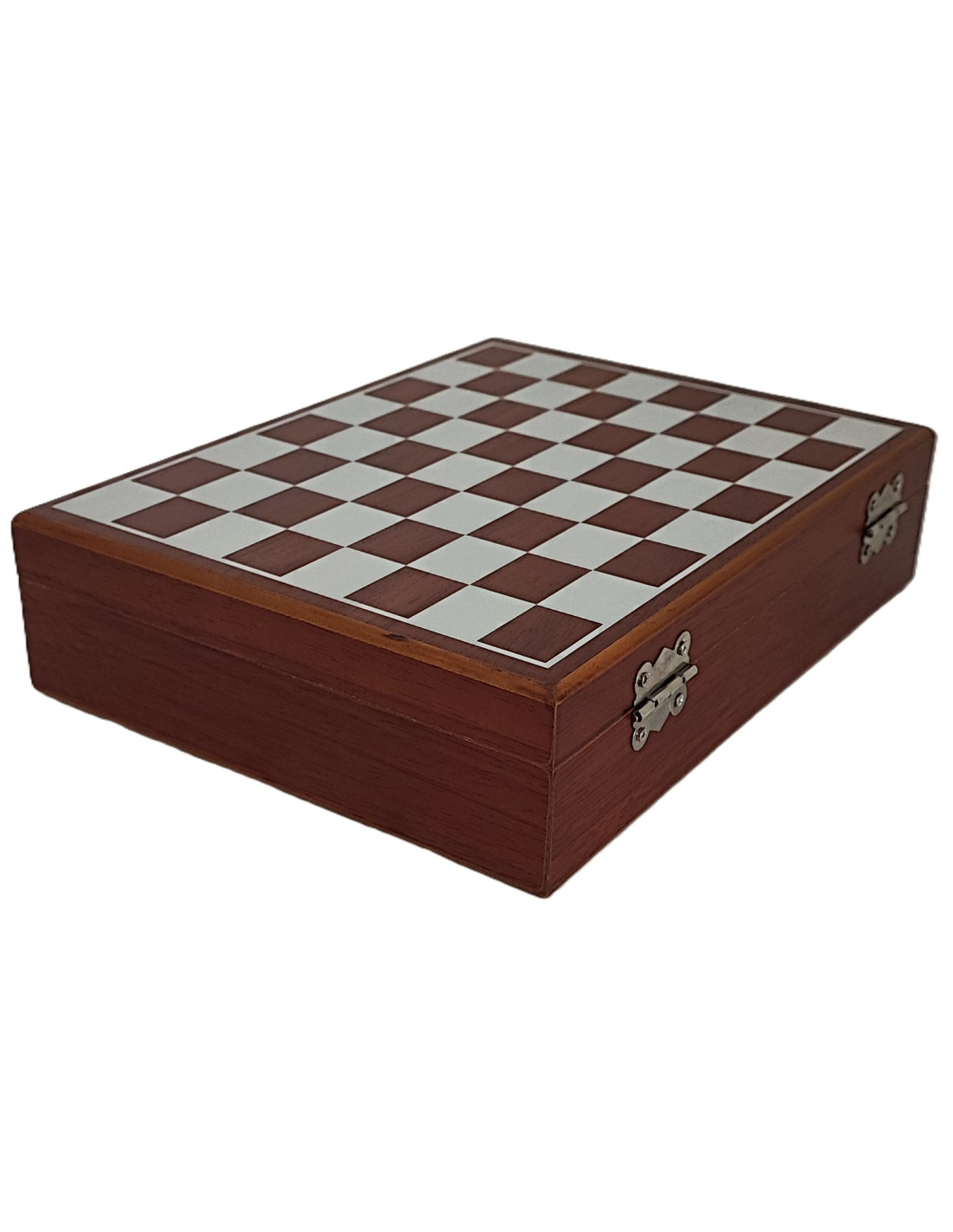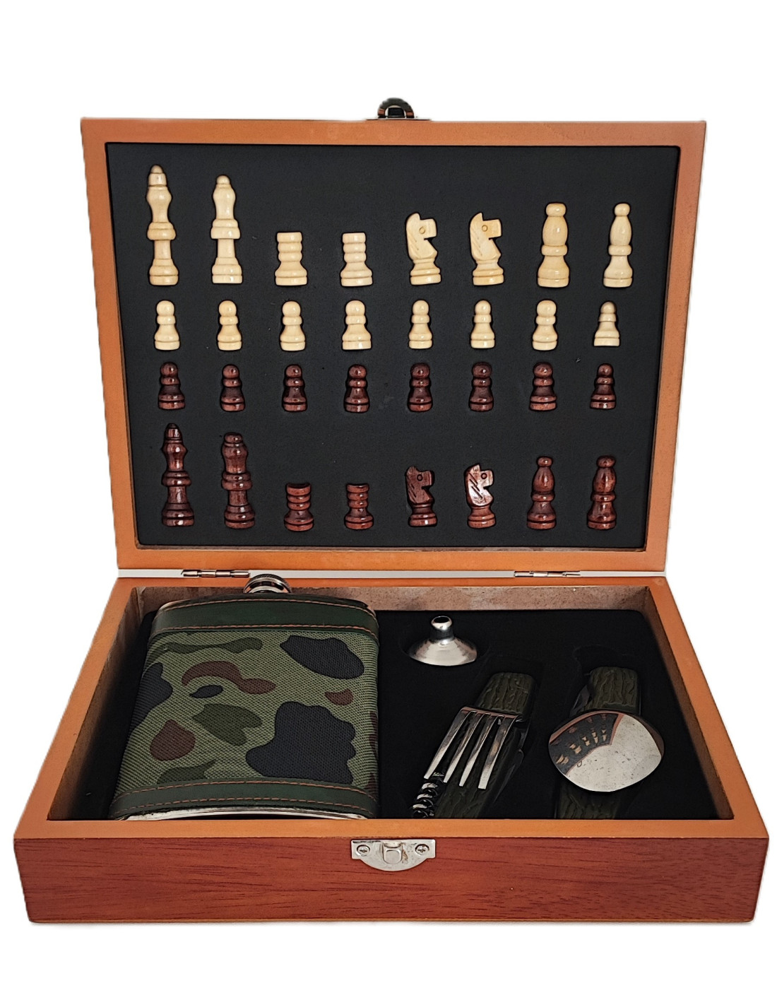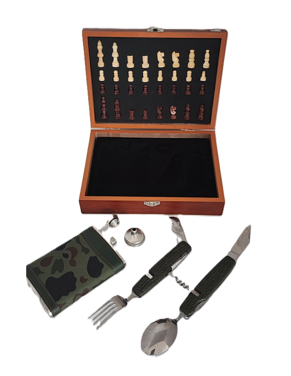 Setul constă într-o cutie de lemn elegantă care combină un set de șah clasic,plosca pentru băuturi si un briceag multifunctional, ideal pentru cadouri sau utilizare personală în călătorii și activități de exterior.