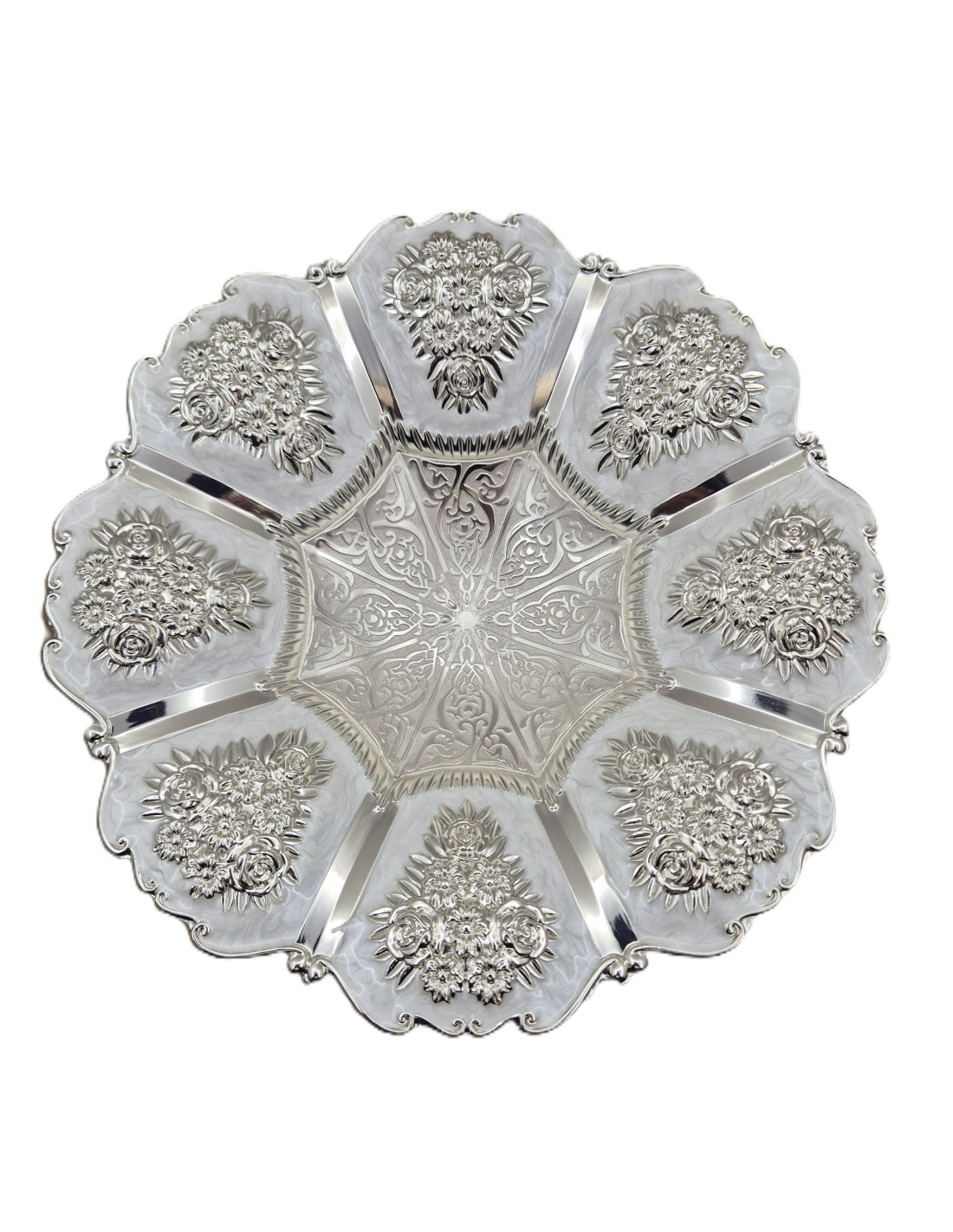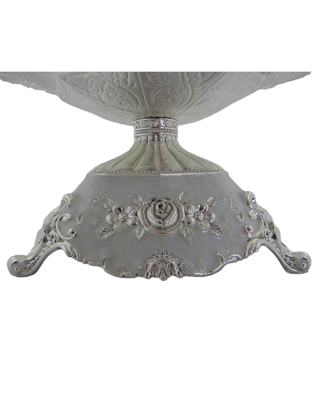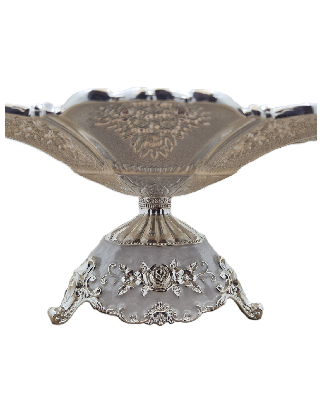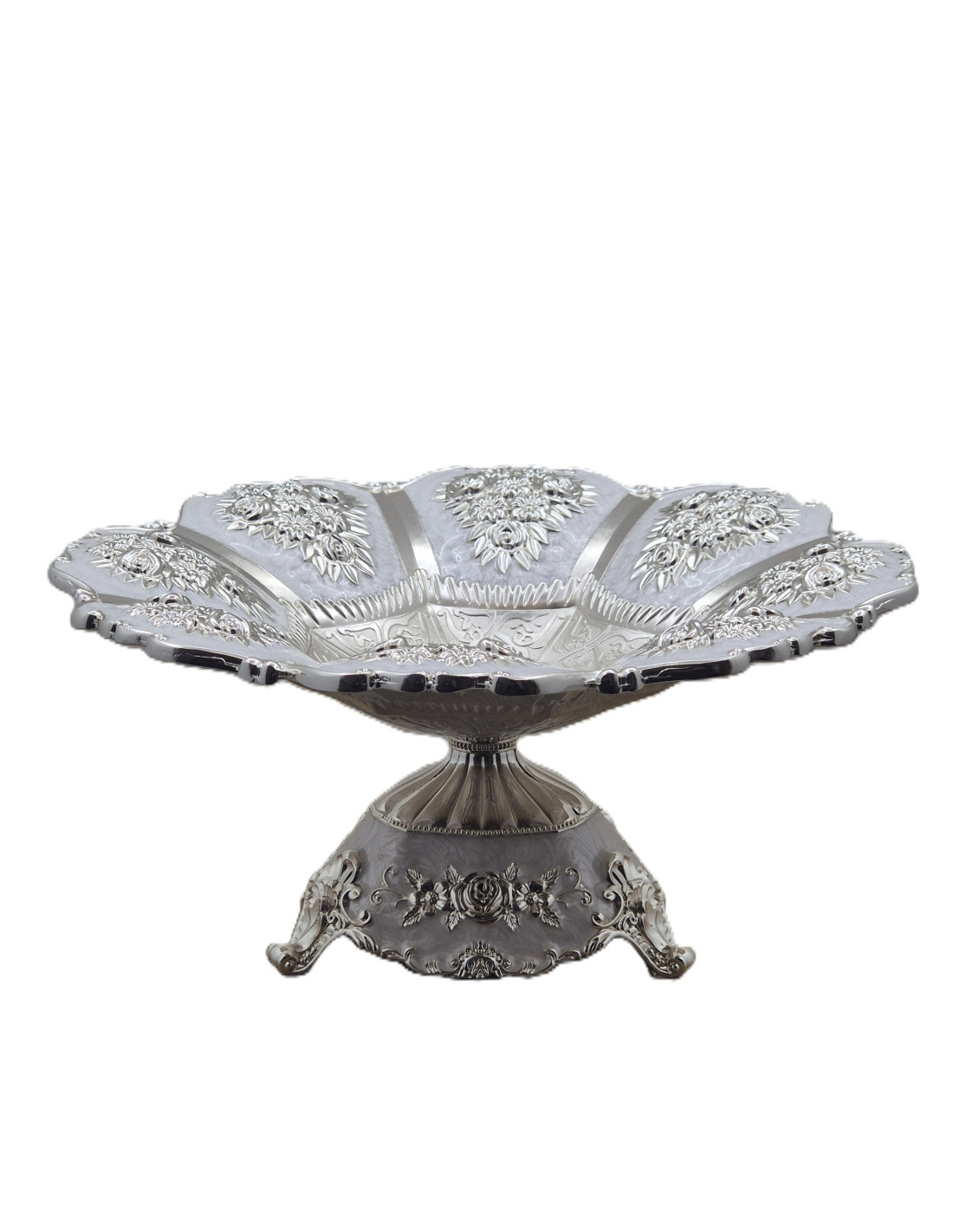 Platou fructiera cu picior, decorativa, argintata, cu un design sofisticat și detalii ornamentale gravate.