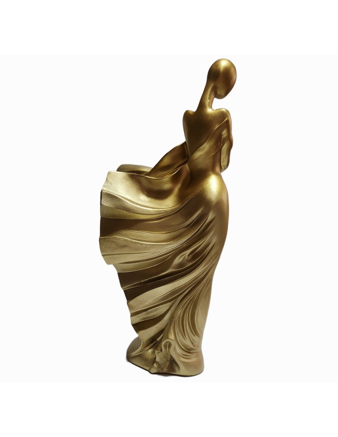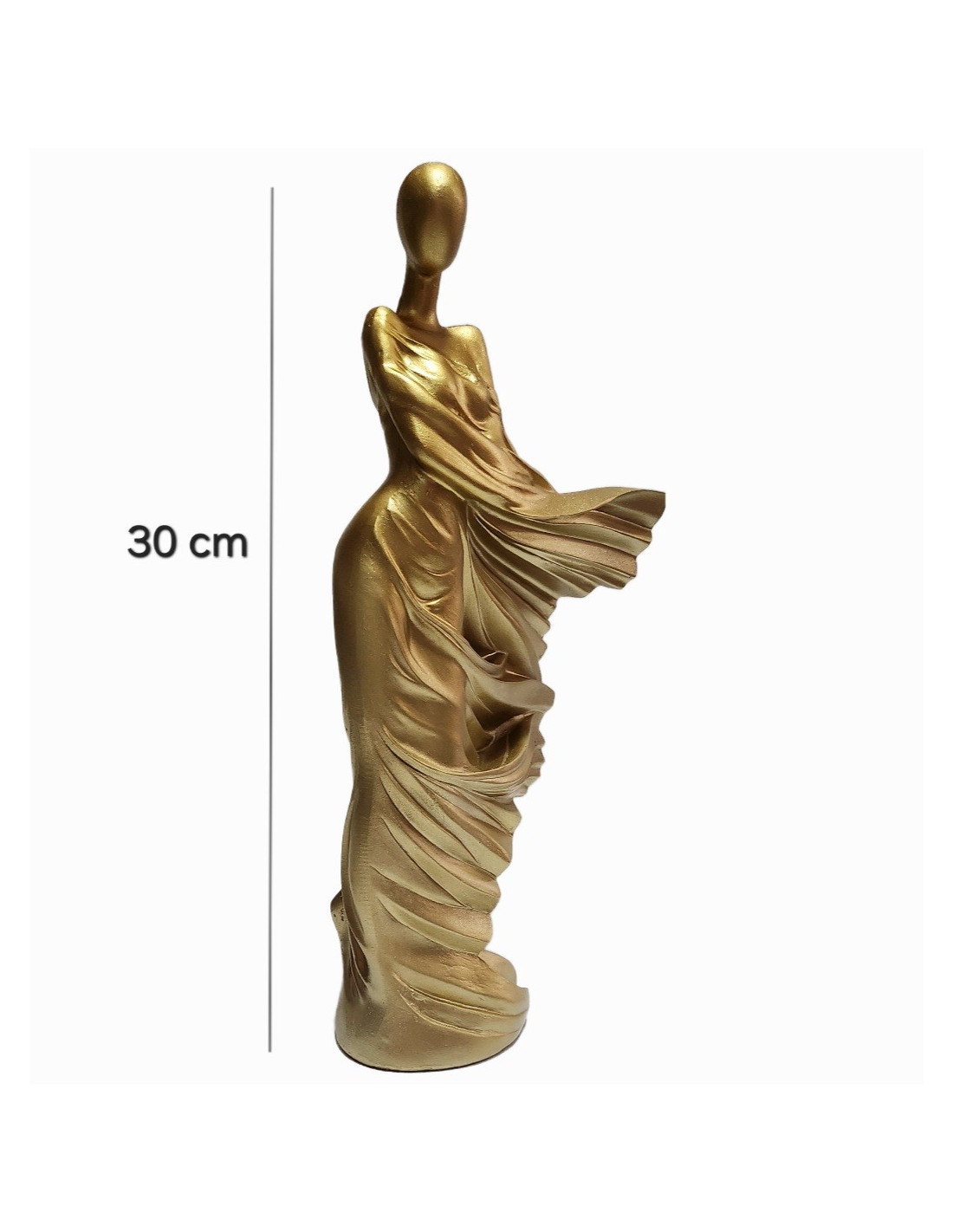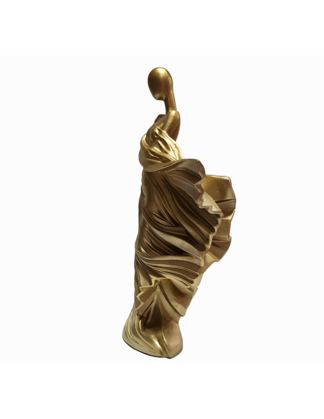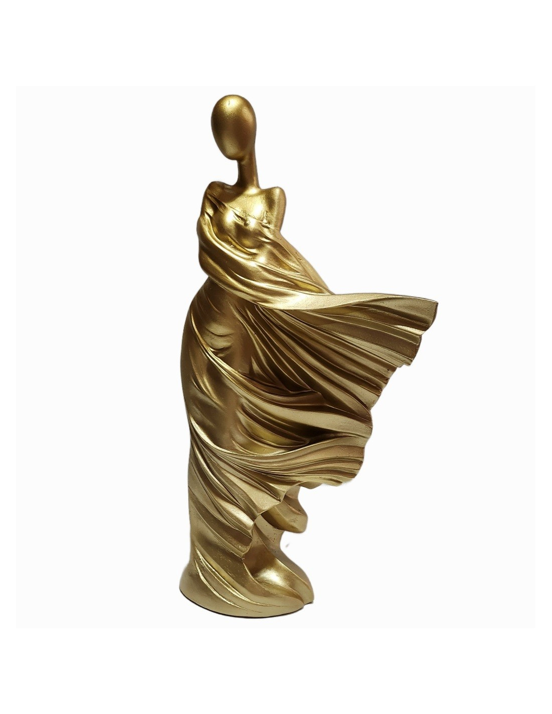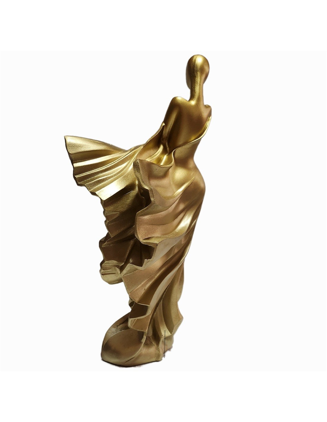 Această statuetă impresionantă, cu înălțimea de 30 cm, reprezintă silueta stilizată a unei femei îmbrăcate într-o rochie elegantă, surprinsă într-un moment de grație și mișcare. Realizată cu un design modern, abstract, piesa captează delicatețea formelor feminine și dinamismul materialului, fiind finisată într-un ton auriu mat care adaugă un plus de rafinament și lumină oricărui spațiu.