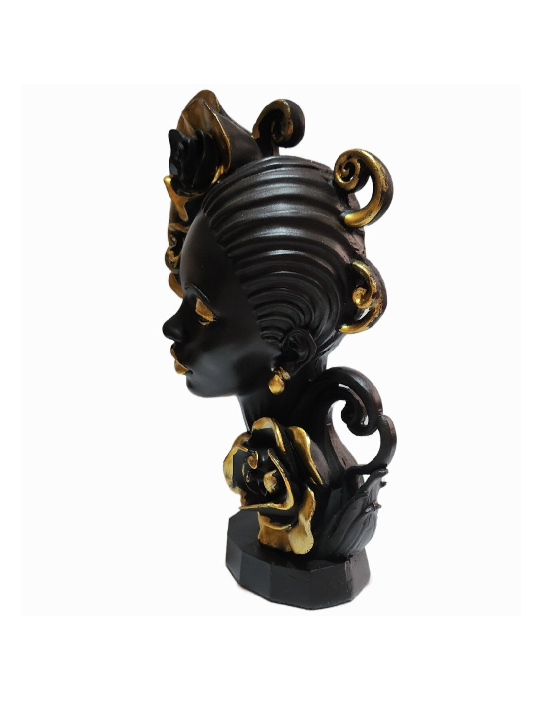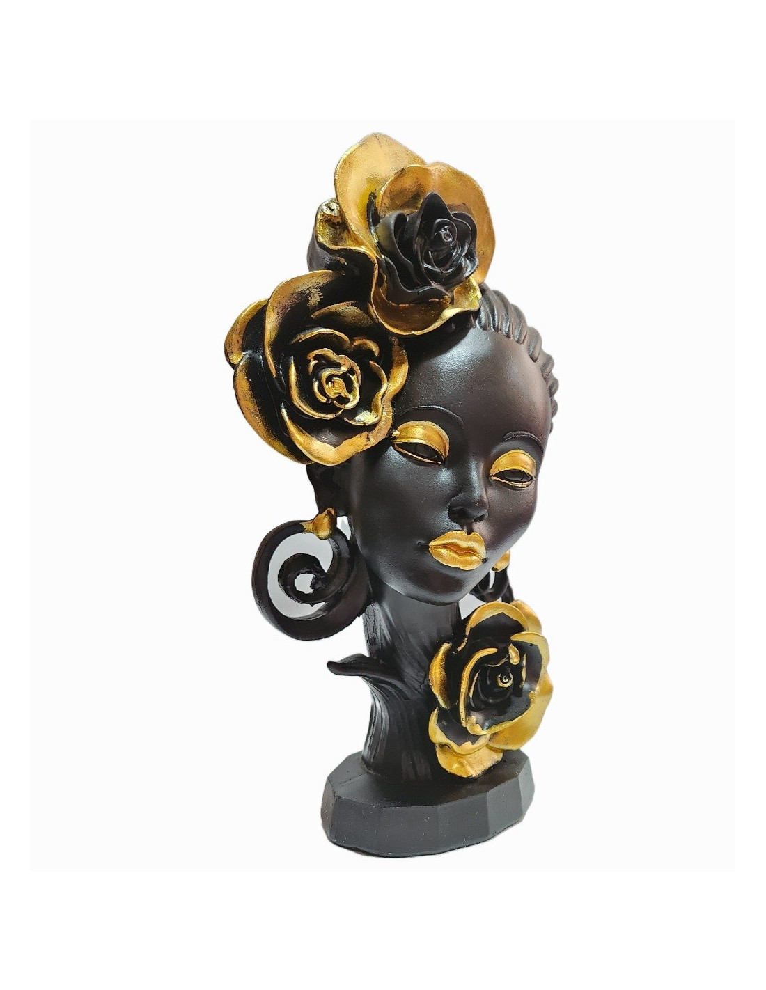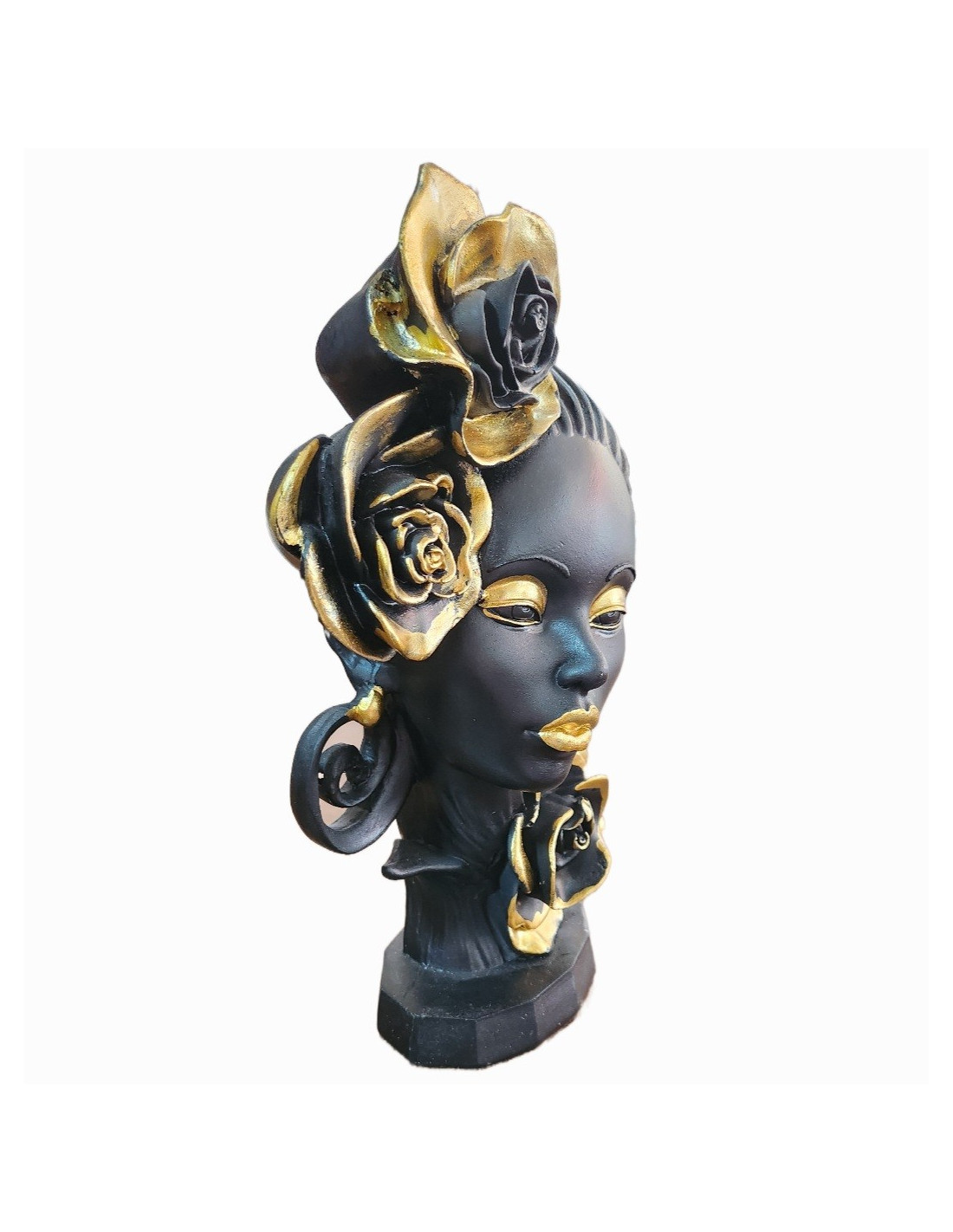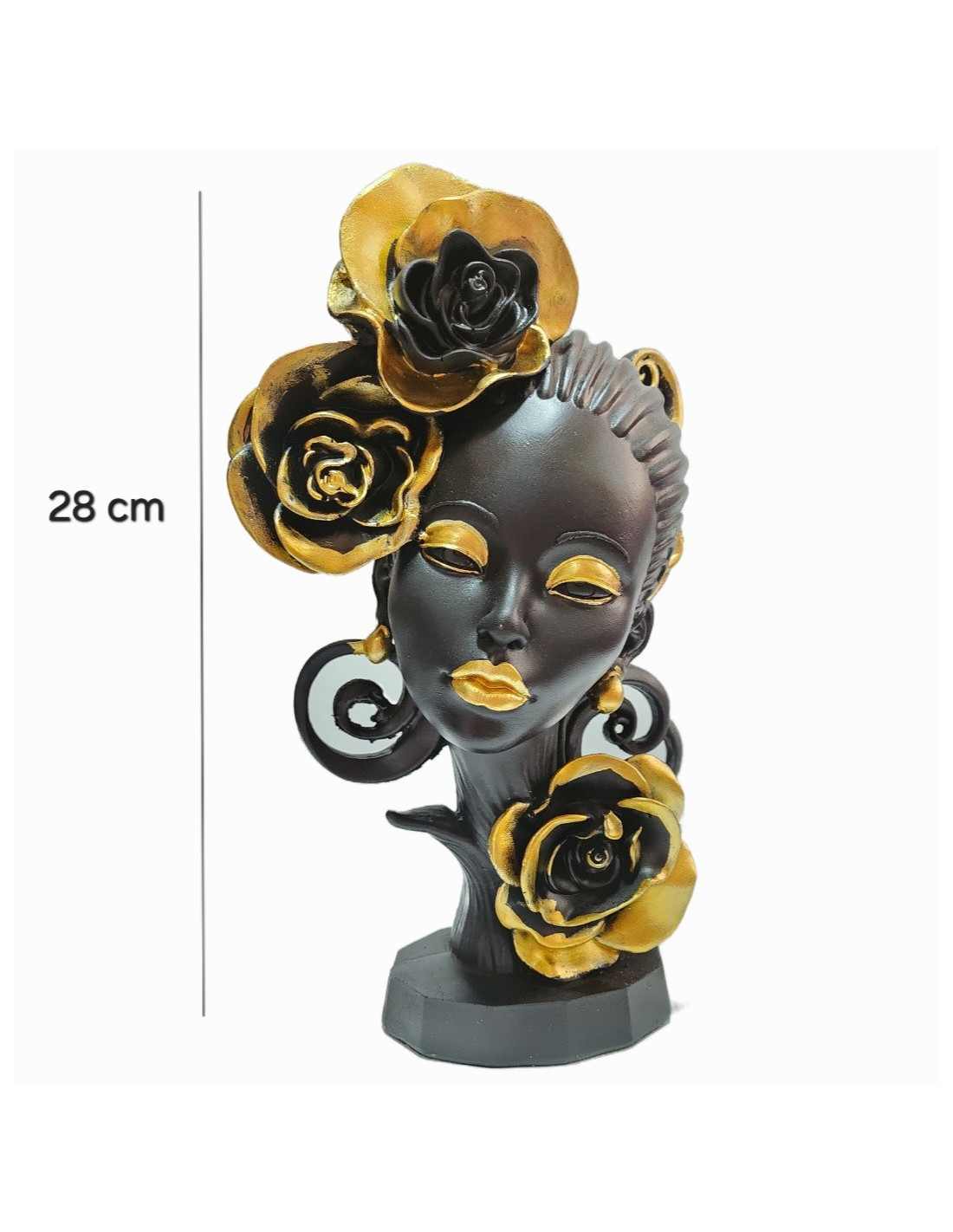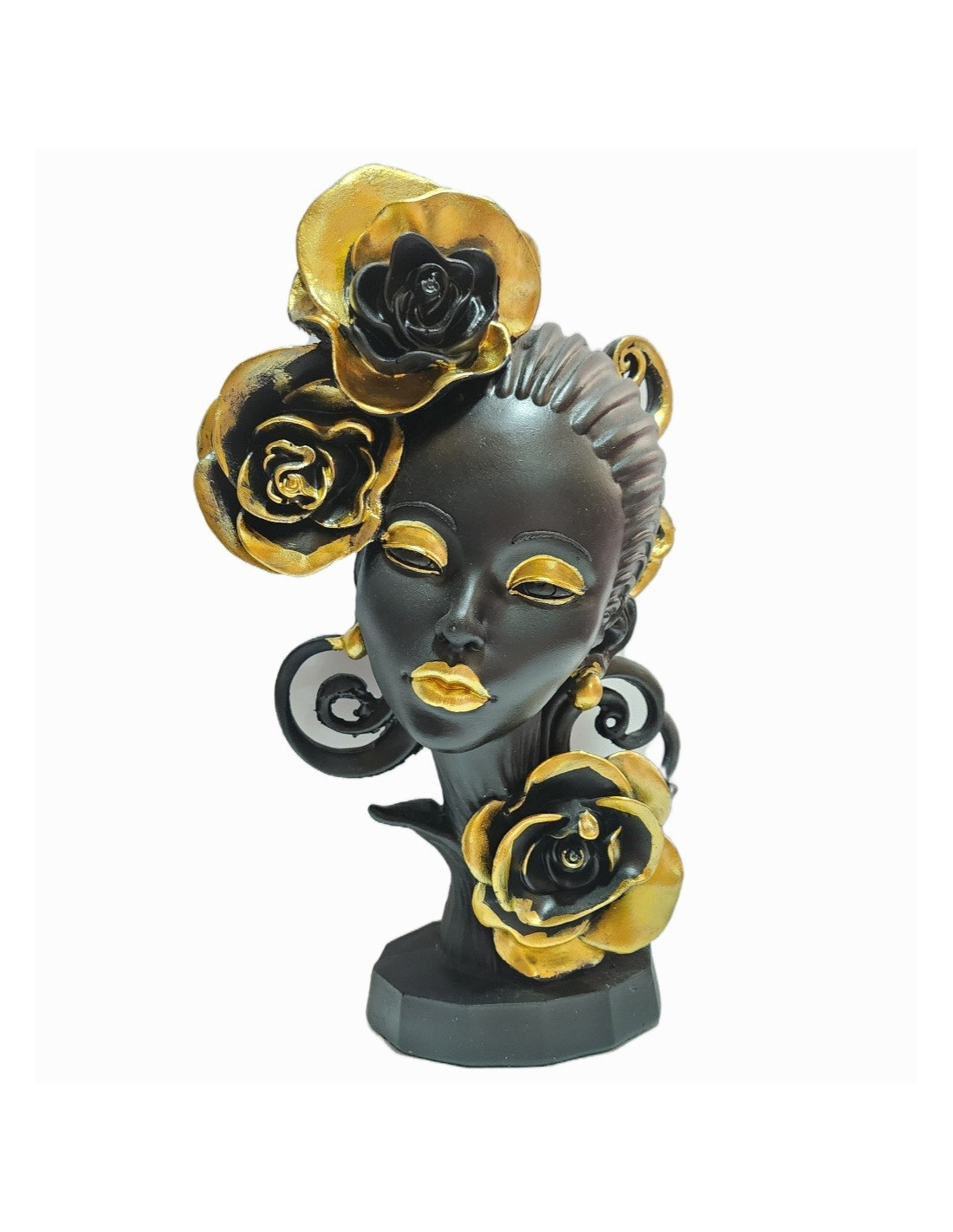 Această statuetă elegantă, cu înălțimea de 28 cm, reprezintă chipul unei femei stilizate, accentuat cu detalii florale aurii spectaculoase. Realizată într-o combinație sofisticată de negru mat și auriu lucios, piesa transmite rafinament, putere feminină și noblețe artistică, transformând orice spațiu într-o zonă de impact vizual.