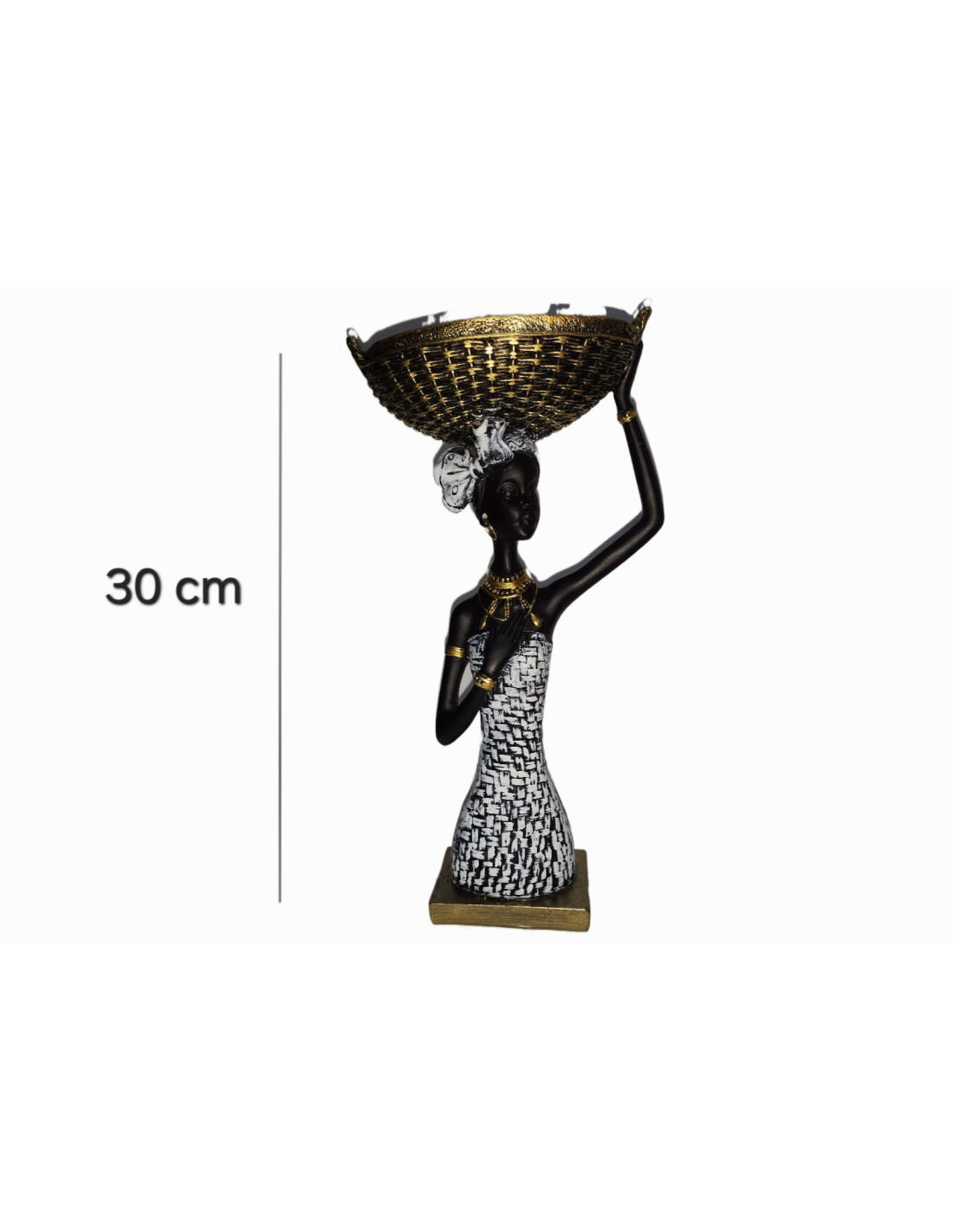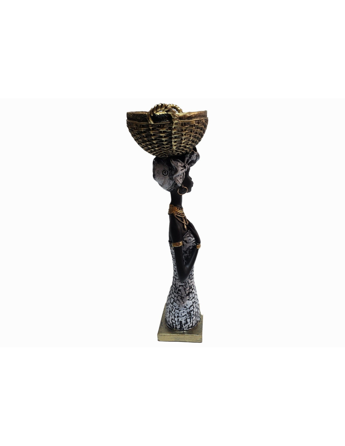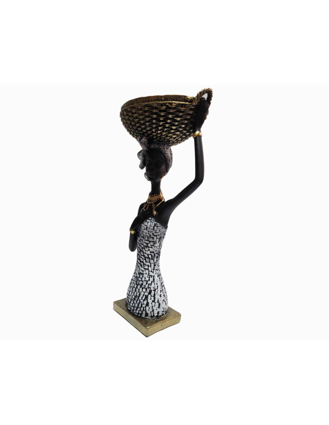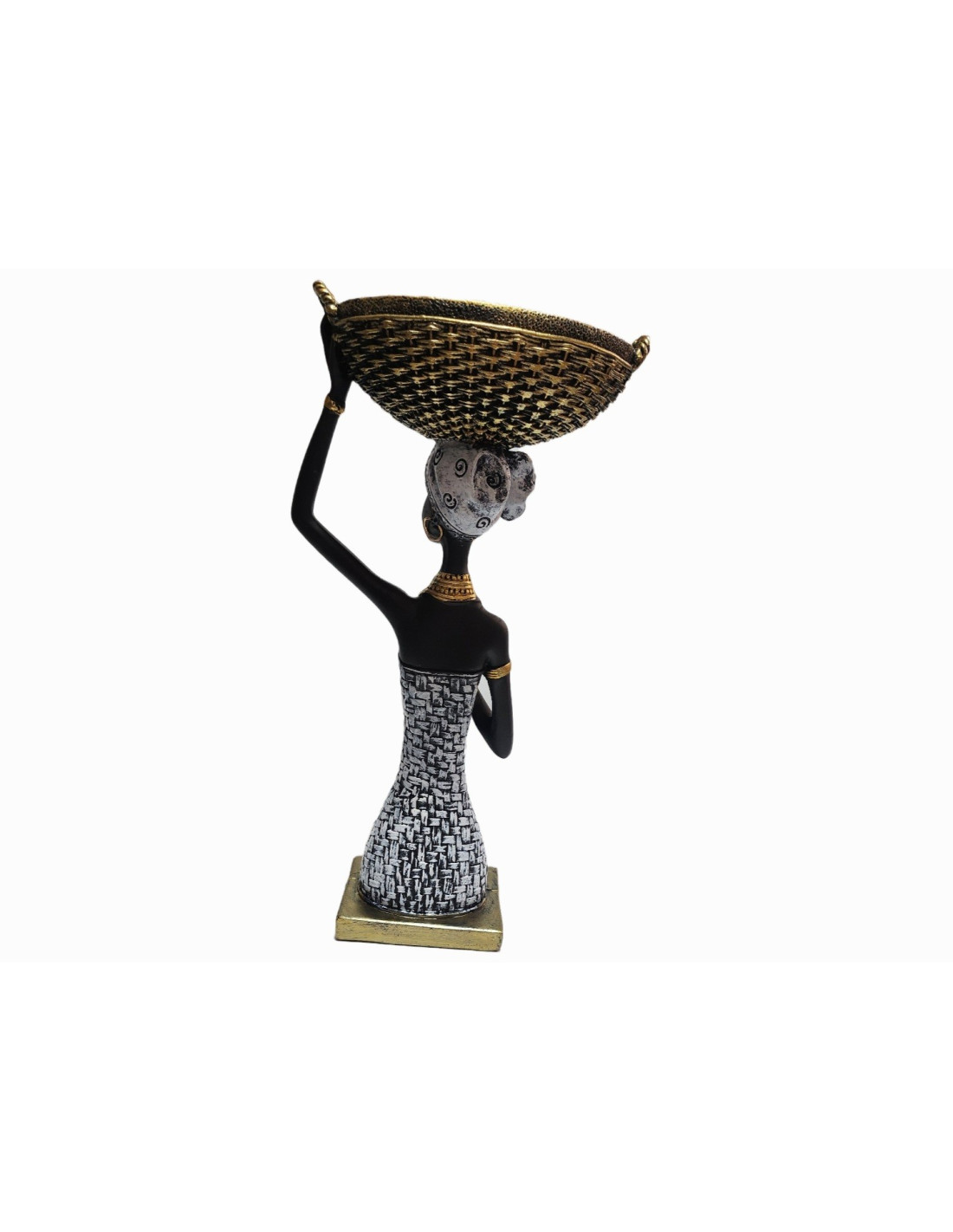 Această statuetă elegantă, cu înălțimea de 30 cm, ilustrează o femeie africană stilizată, surprinsă într-o postură grațioasă, purtând un coș tradițional pe cap. Realizată din rășina și finisată manual, piesa îmbină armonios nuanțele de negru, alb și auriu, oferind un aspect modern și sofisticat.