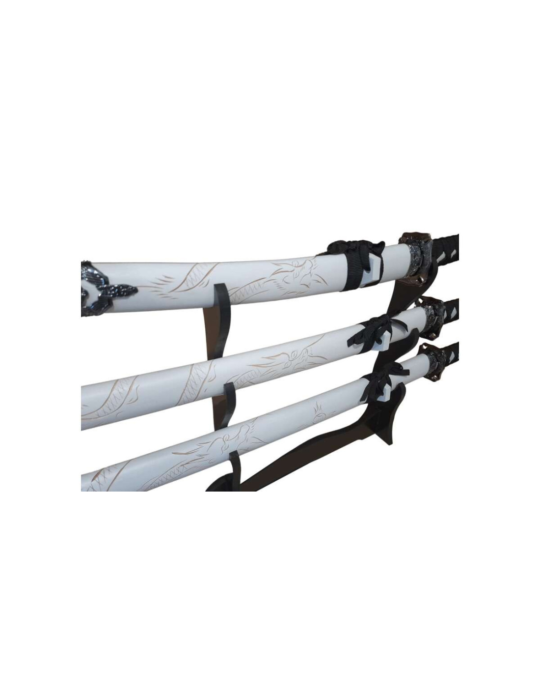 Setul de 3 săbii vine însoţit de un suport de lemn pentru un aspect autentic.