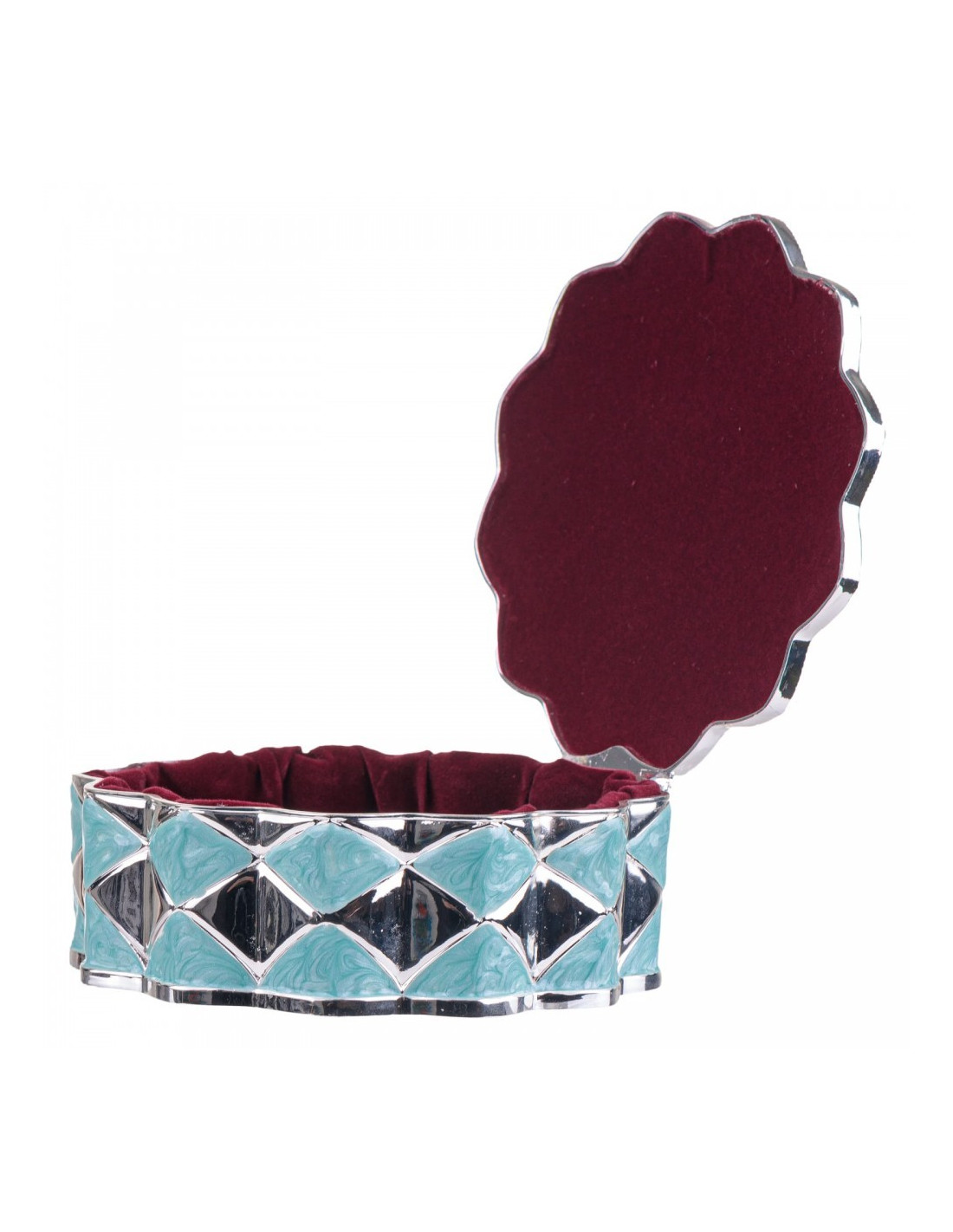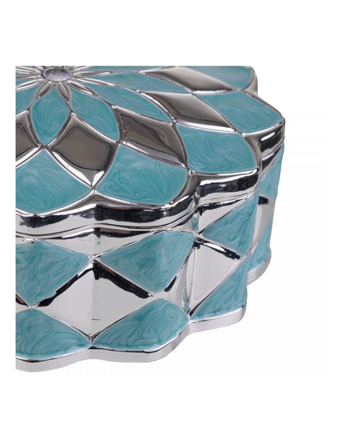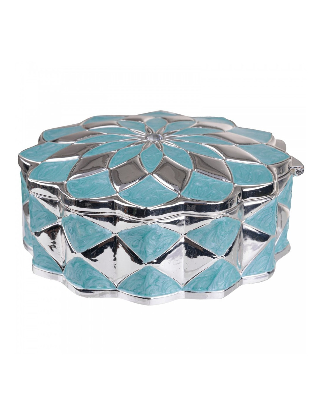 Casetă de bijuterii metalică din zinc argintat în formă de floare, albastră.