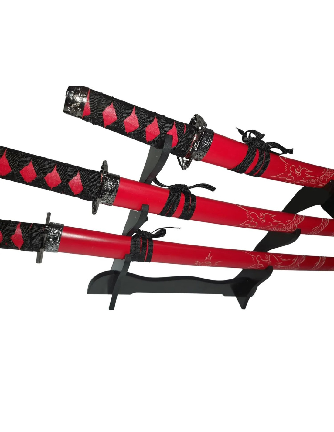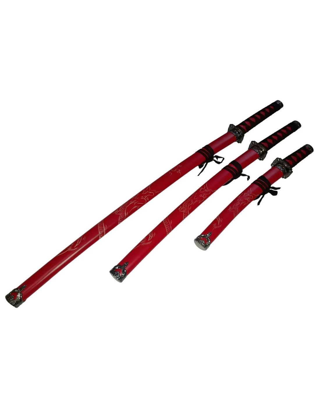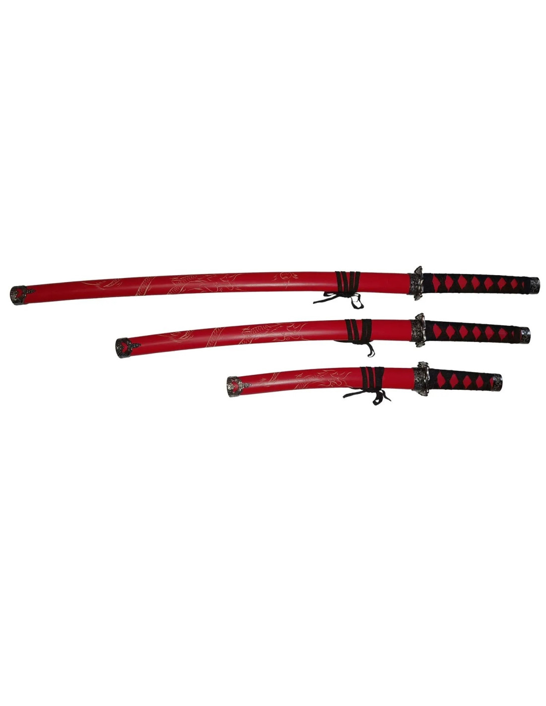 Set cadou 3 săbii katane japoneze decorative, panoplie, roșu, metalic, teacă.