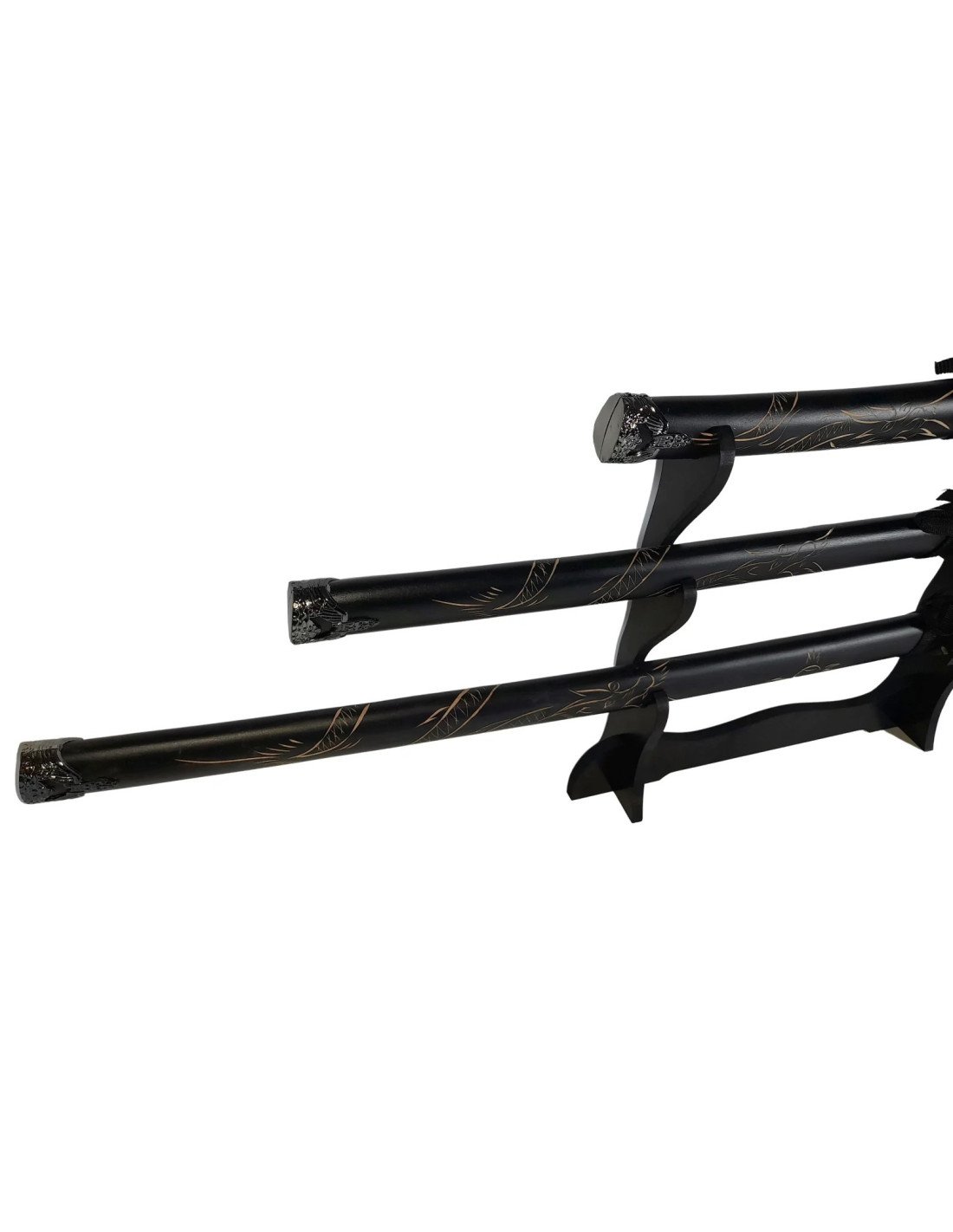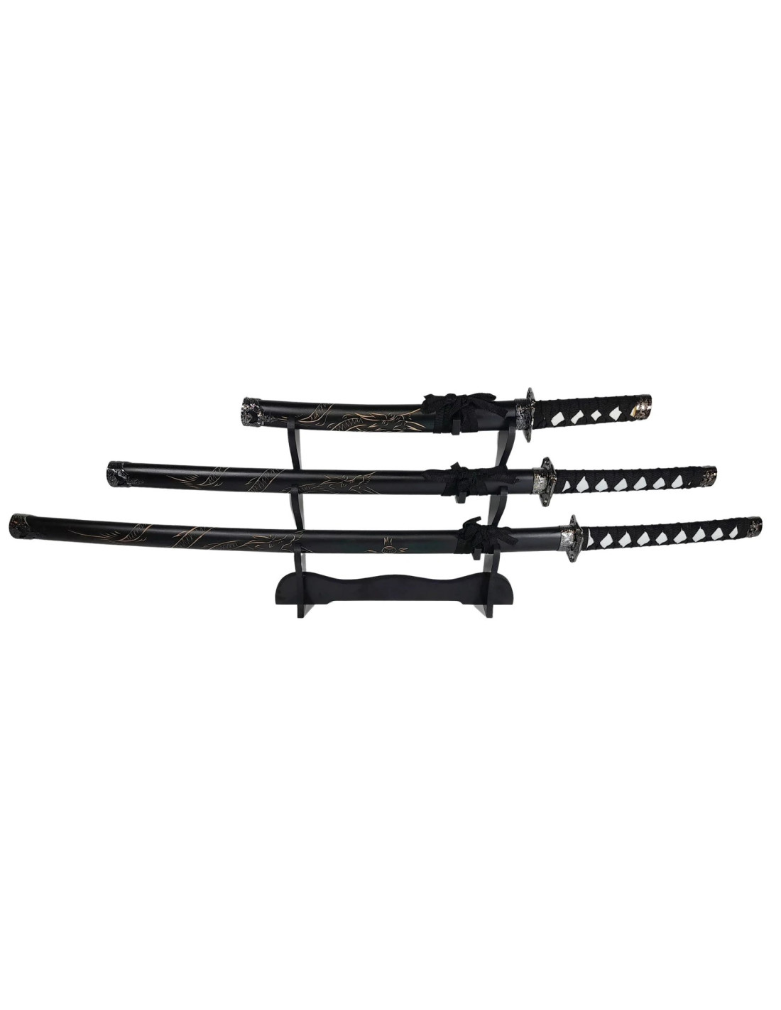 Setul de 3 săbii vine însoţit de un suport de lemn pentru un aspect autentic.