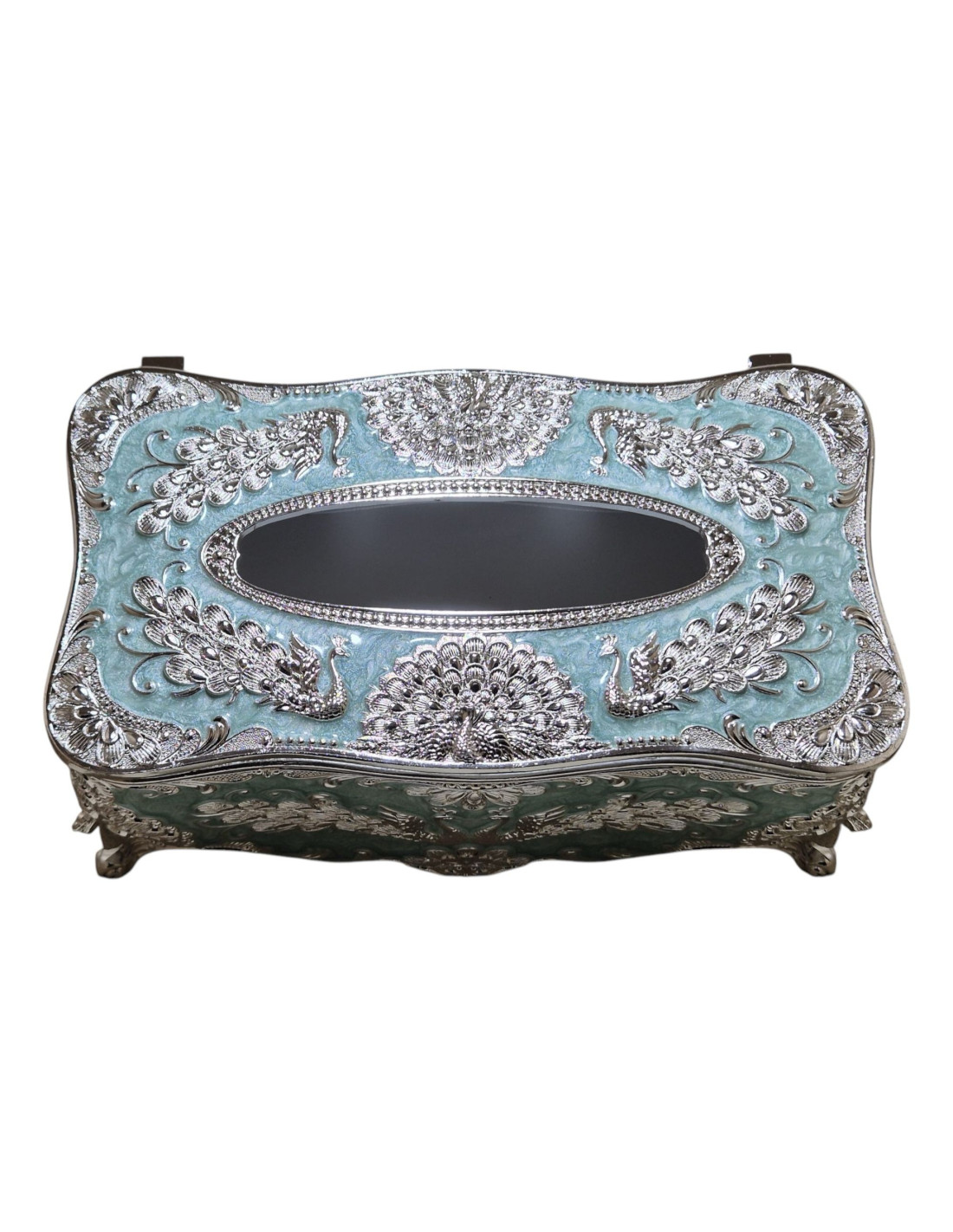 Motiv decorativ: Cutia este împodobită cu modele de păuni în relief, simboluri ale eleganței și regalității. Aceste detalii sunt completate de arabescuri și motive florale fine, atât pe capac, cât și pe laterale.