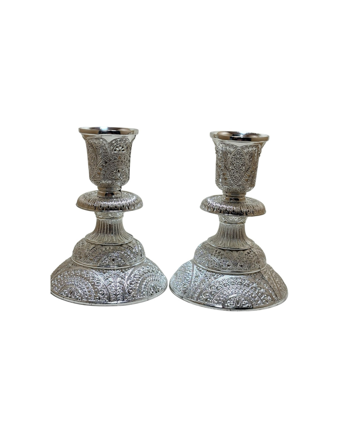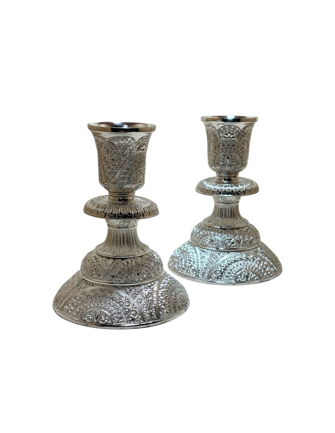 Suportul pentru lumanare este in forma de cupa cu margini evazate decorat cu modele similare cu cele de pe baza si picior.