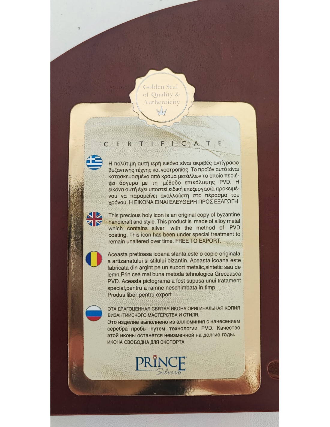 Icoana este fabricată din argint pe un suport metalic şi este supusă unui tratament special de protecţie pentru a rămâne neschimbată în timp.