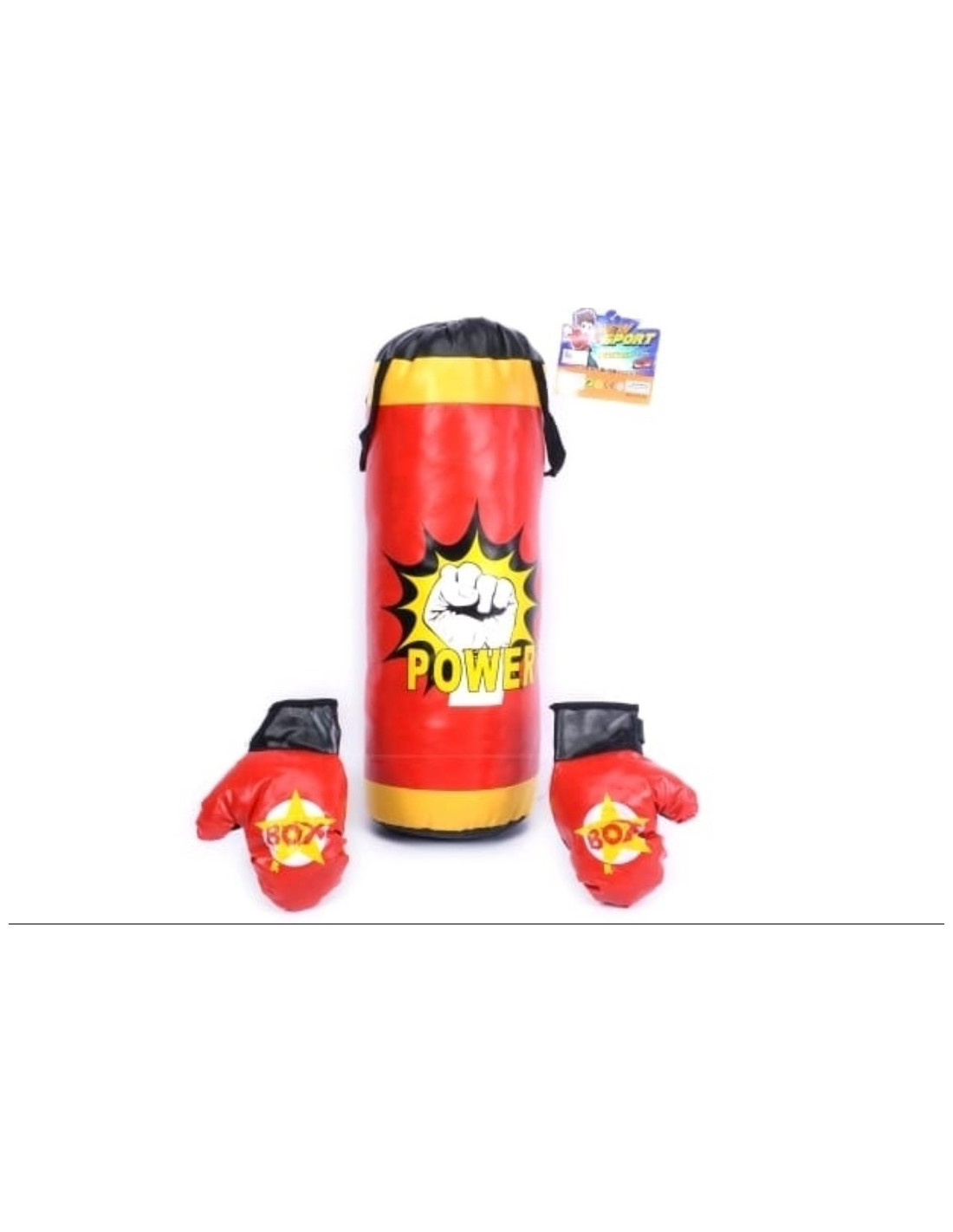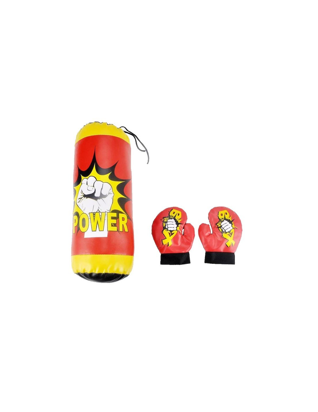 Setul include si manusi de box care ofera protectie si confort in timpul antrenamentelor. Designul colorat in rosu si galben atrage atentia si adauga o nota de entuziasm in timpul jocului.