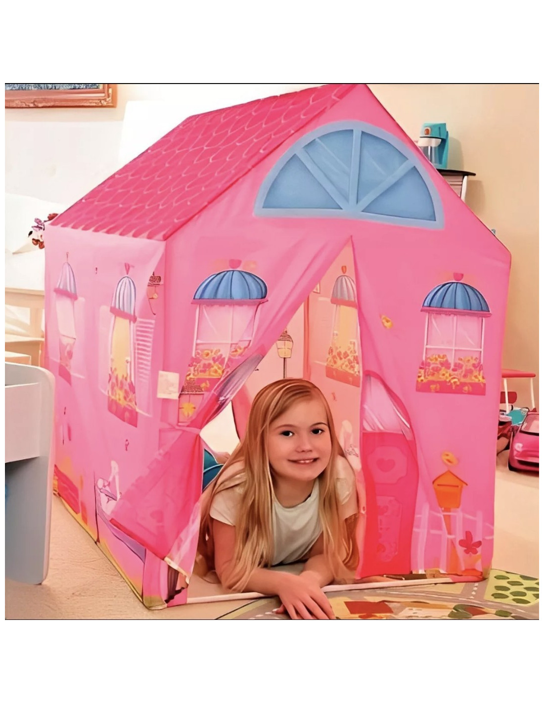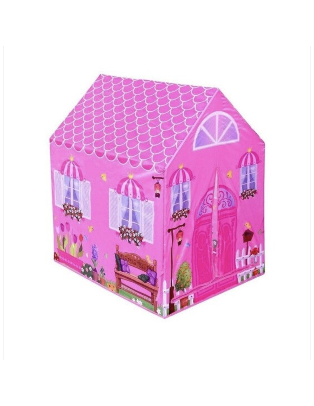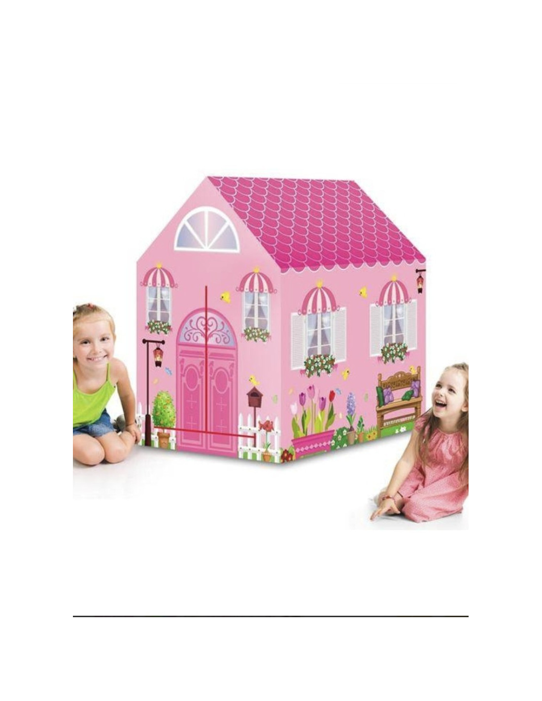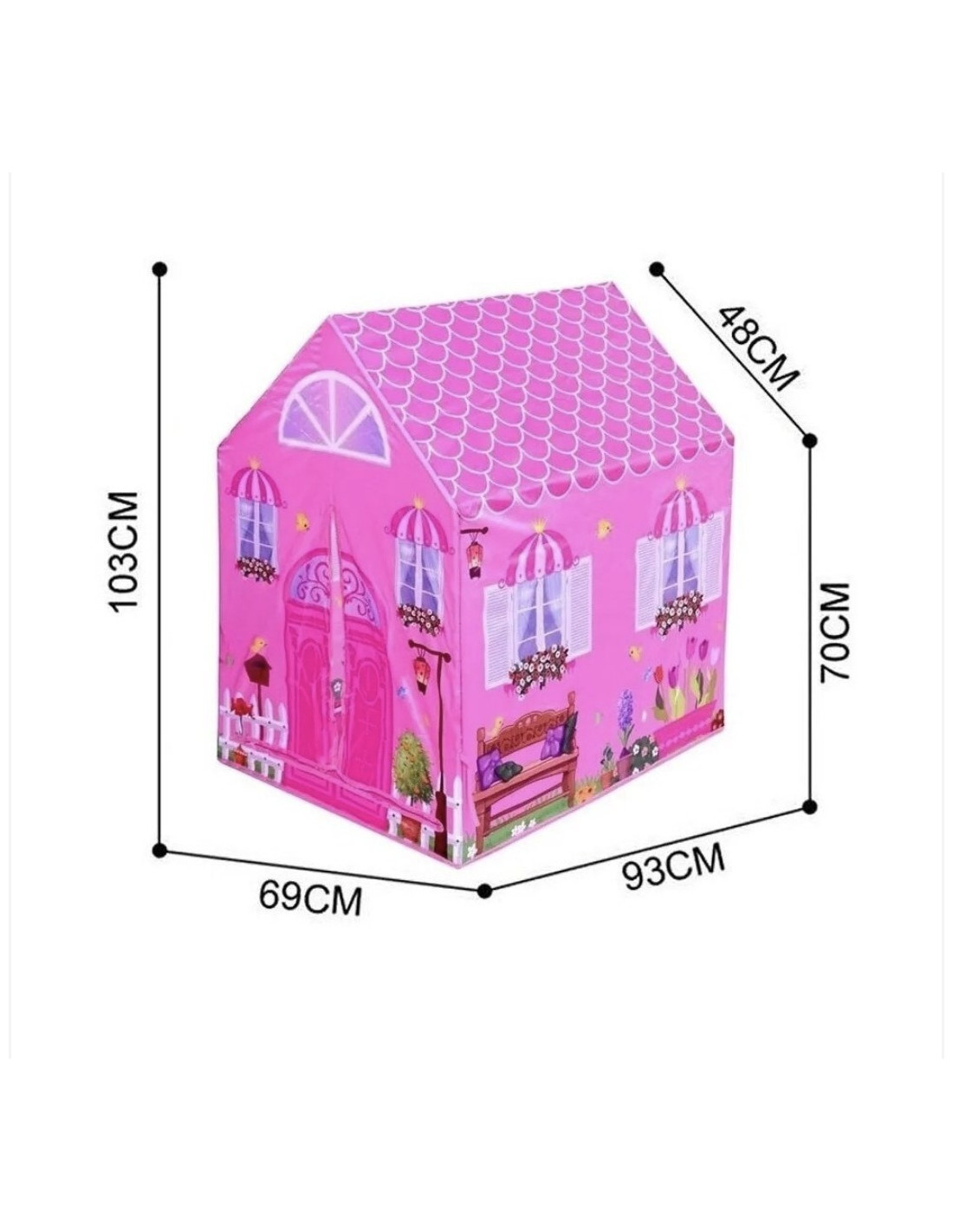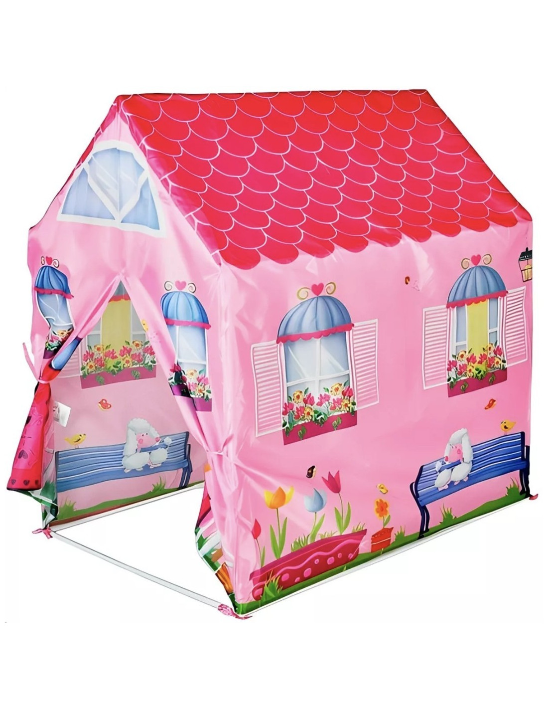 Cort de joacă pentru copii în formă de căsuță. Structura este realizată dintr-un cadru metalic ușor, acoperit cu un material plastic viu colorat. Designul exterior al cortului imită o casă de poveste, având pereți roz decorați cu ferestre albastre și obloane deschise, jardiniere pline cu flori, băncuțe albastre și jucării de pluș desenate. Acoperișul are un model de țiglă roșie, iar pe fundal apar flori, fluturi și alte elemente decorative, oferind un aspect vesel și prietenos. Intrarea este realizată dintr-o deschidere cu material textil care poate fi ridicat și prins in lateral.
