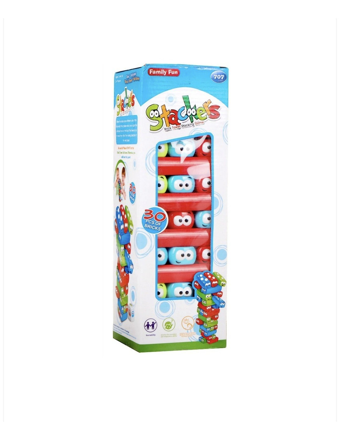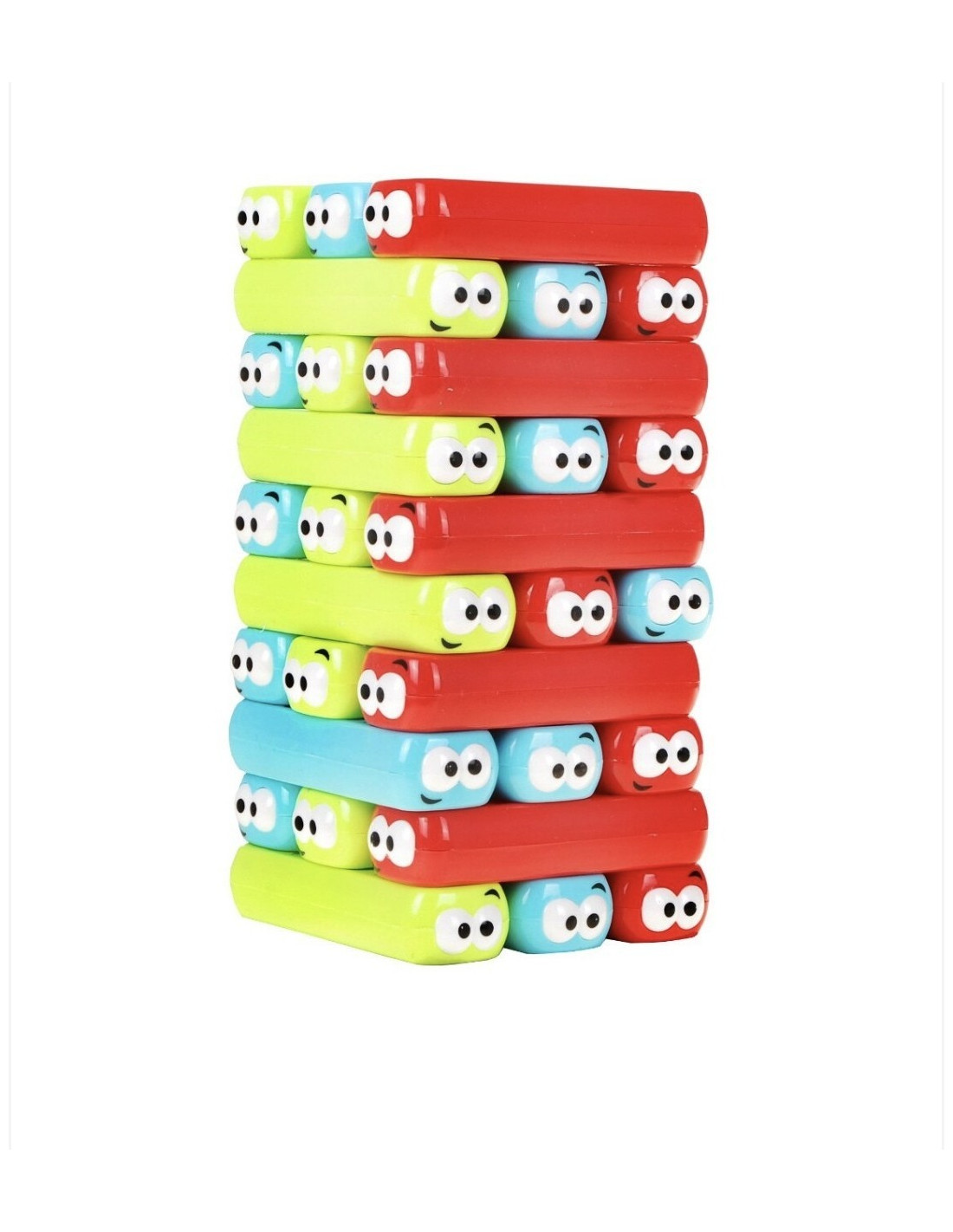 Aceasta este o variantă a jocului Jenga, denumită "Stackers," cu piese colorate și cu ochi desenati pe ele. Jocul conține 30 de piese în culori diferite (roșu, albastru și verde) și un zar cu aceleași culori.