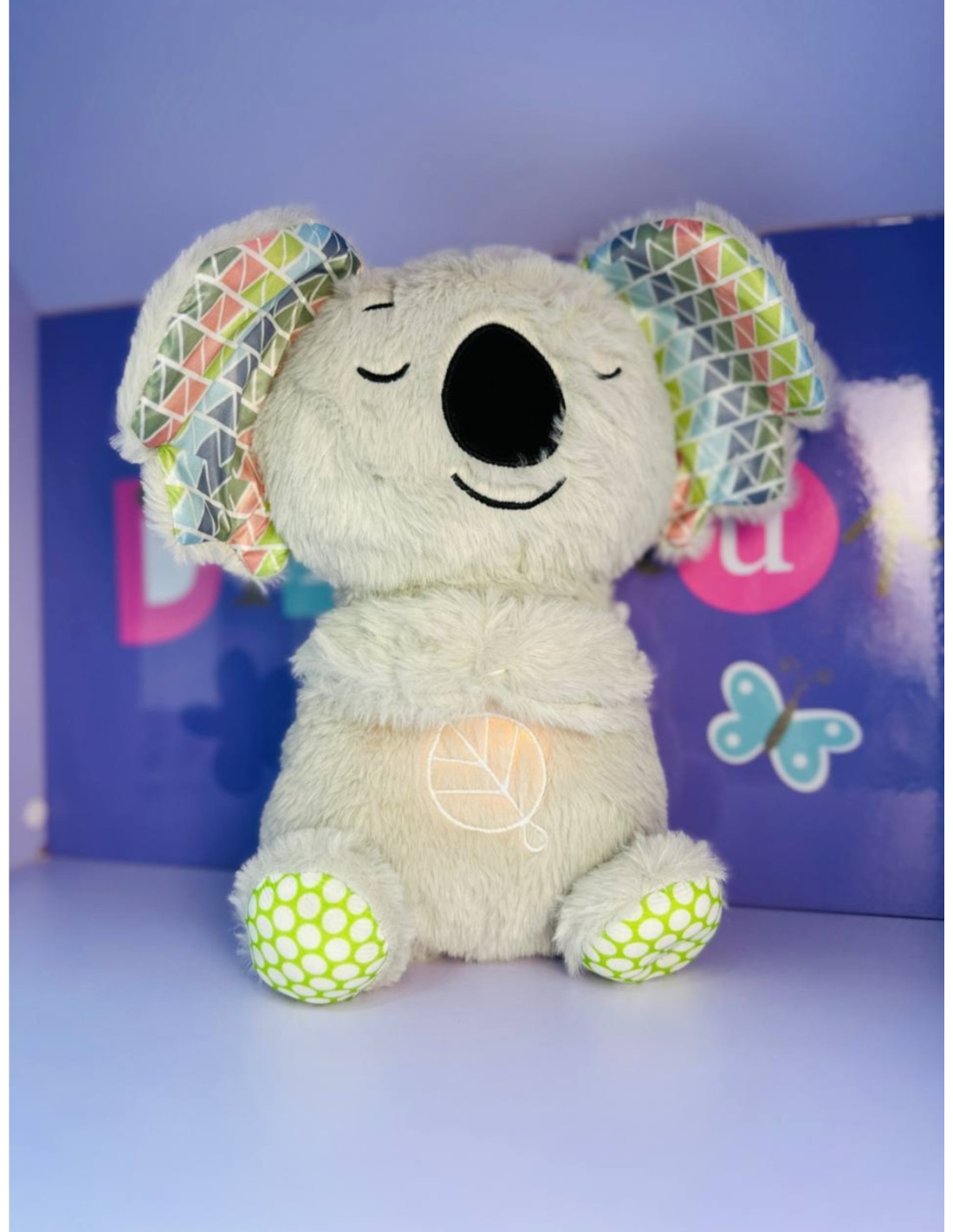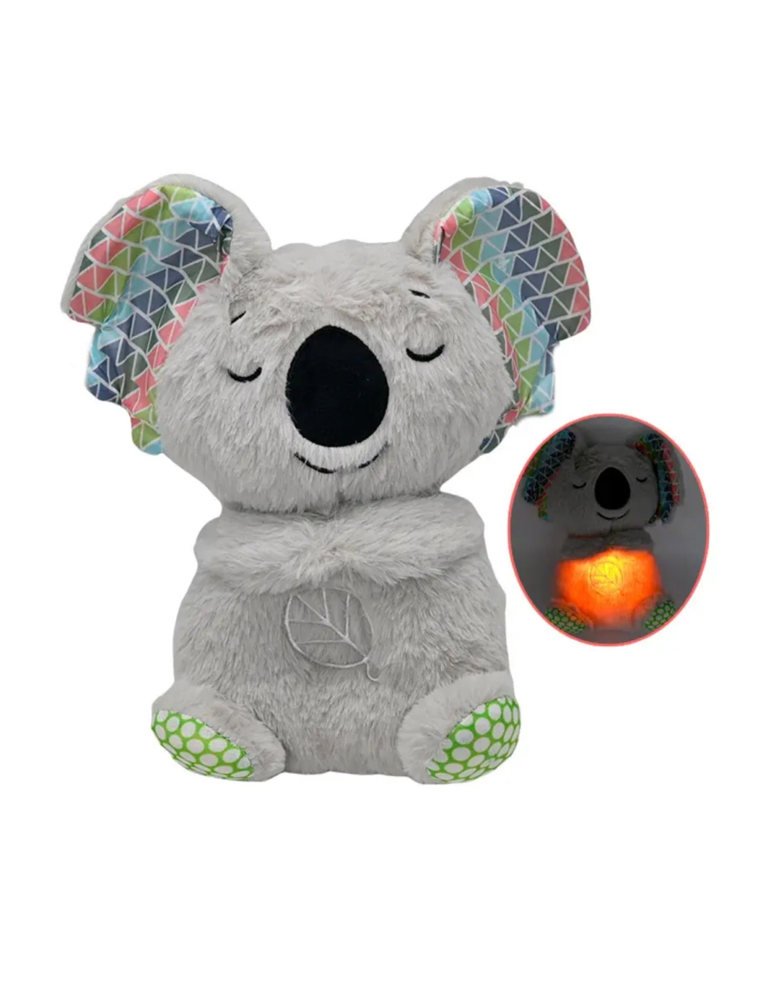 Jucăria din imagine este o jucărie de pluș interactivă Koala care respiră, concepută pentru a induce o stare de calm și relaxare. Este un companion ideal pentru somn, potrivit atât pentru bebeluși, cât și pentru adulți, datorită texturii sale moi și funcțiilor liniștitoare.