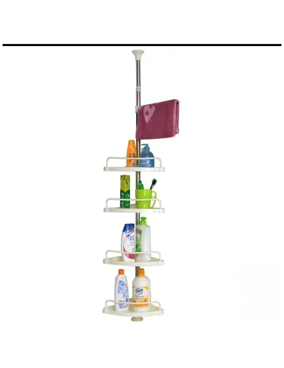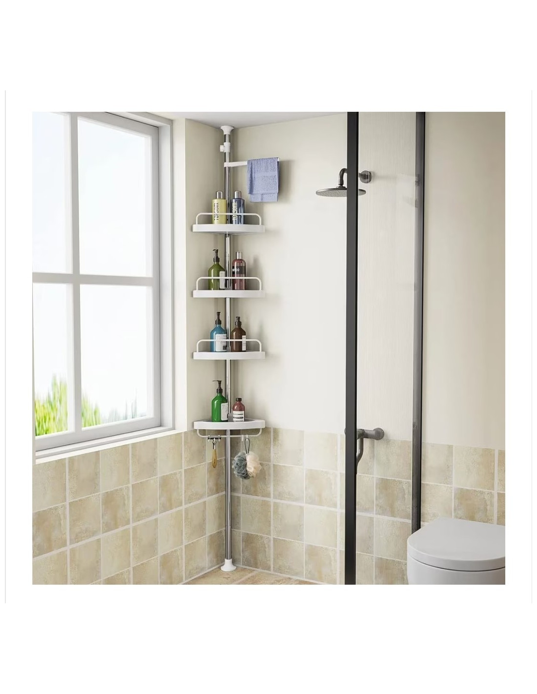 Raft pentru baie,4 nivele, 3 carlige, suport prosop, reglabil 100-320 cm, montare pe colt, alb