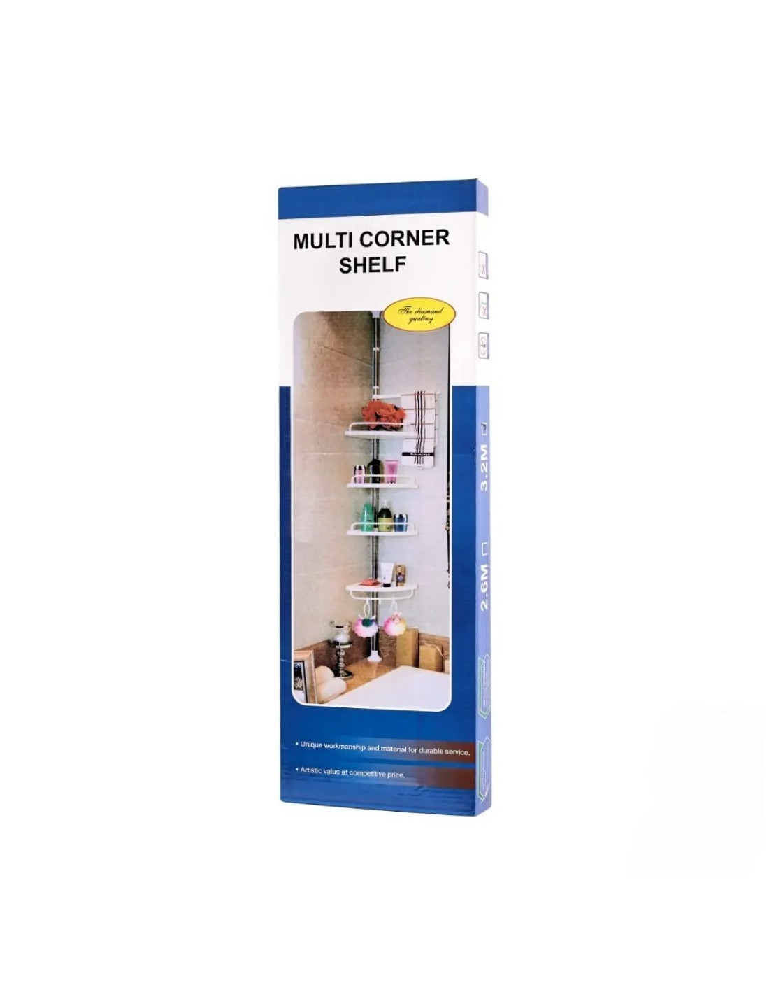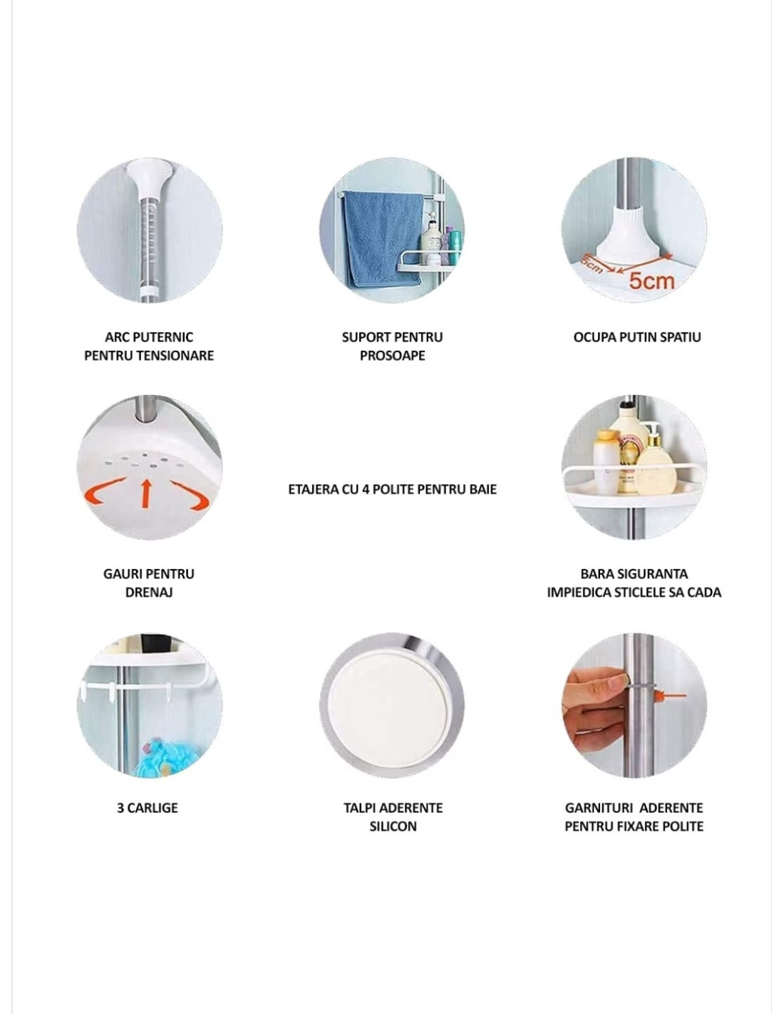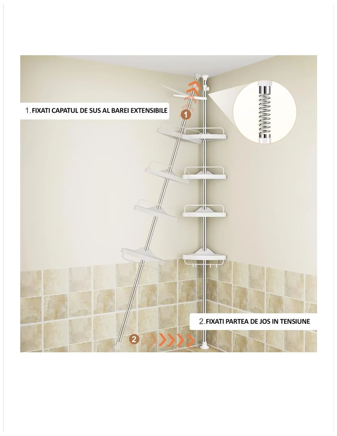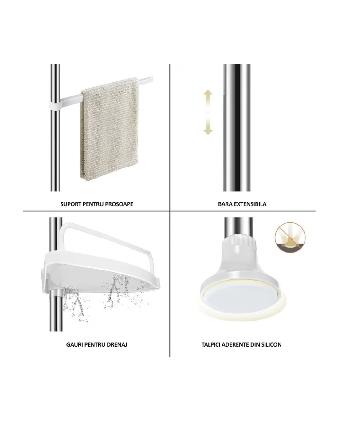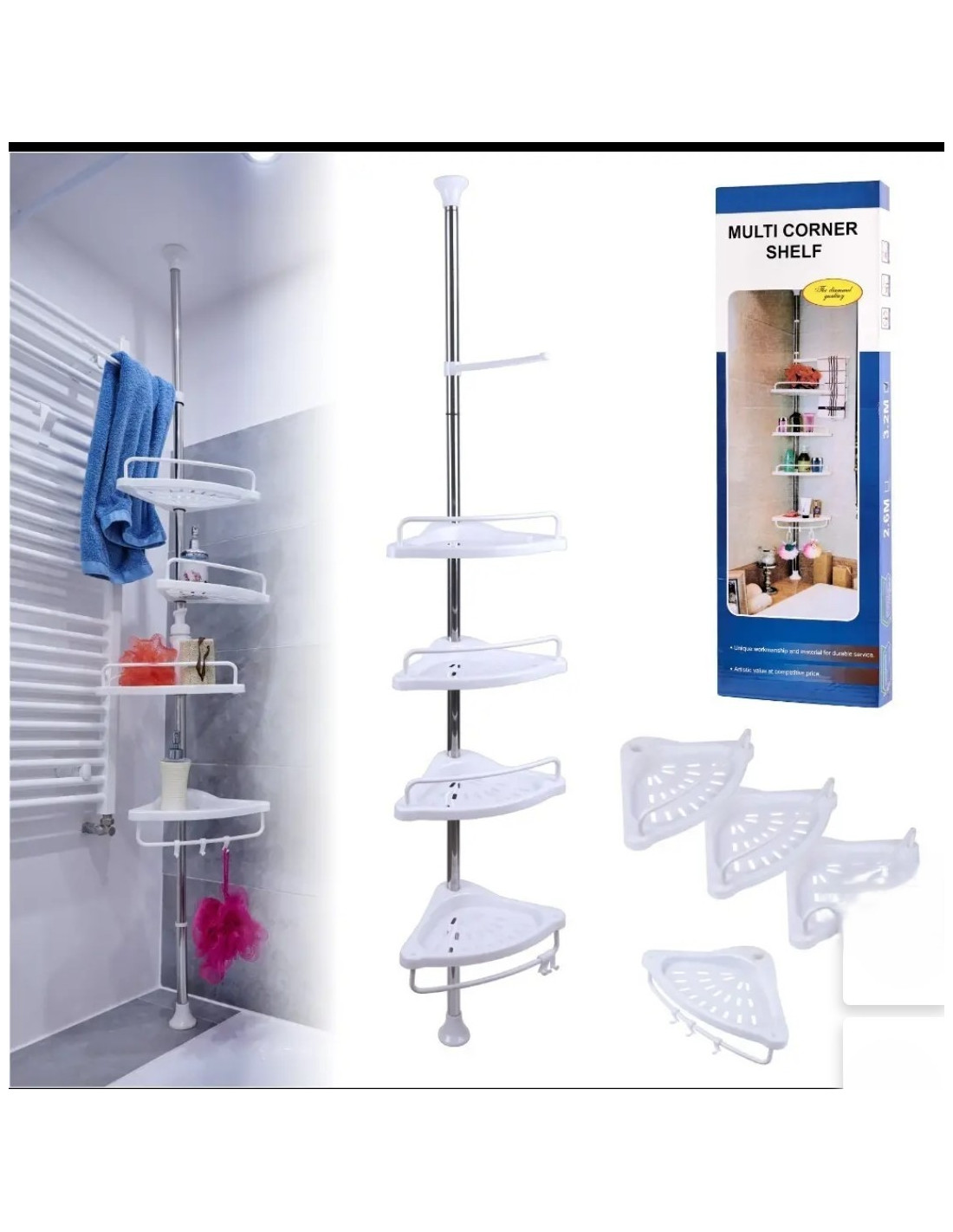 Inaltimea suportului si distanta dintre rafturi sunt reglabile in functie de preferinte. Acest raft este potrivit pentru a fi montat in coltul unei cazi sau a unei cabine de dus. Raftul este foarte usor de montat si demontat fara a fi nevoie de accesorii suplimentare pentru montarea acestuia.