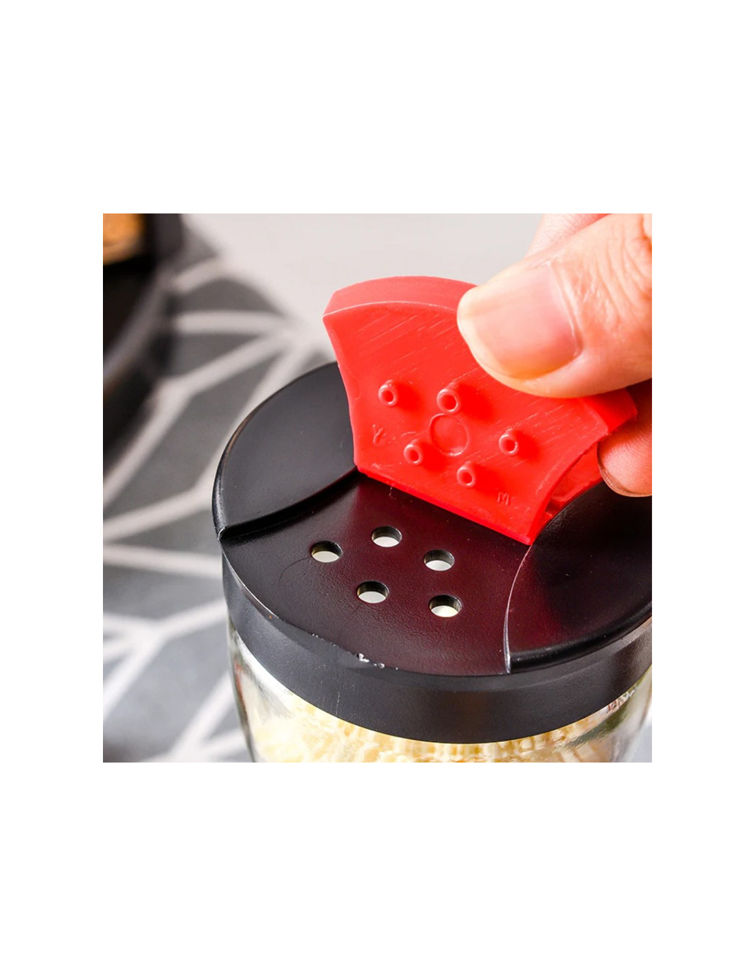 - Capacele sunt negre, cu inserții roșii care permit reglarea fluxului de condimente, fie pentru turnare, fie pentru presărare.